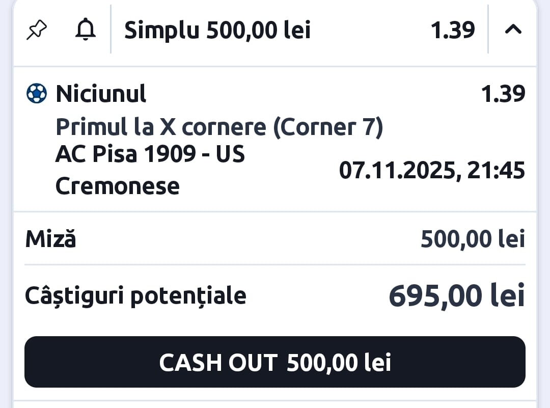 Pe 07.11.2025, Pontul Zilei se aliniază cu cifrele sezonului: Pisa și Cremonese sunt între echipele cu cele mai scăzute volume la cornere. Niciuna nu a atins pragul de 7 cornere într-un meci, iar mediile totale indică partide subliniate de prudență tactică. Ponturi Hunter recomandă selecția logică și disciplinată, disponibilă pe Betano.